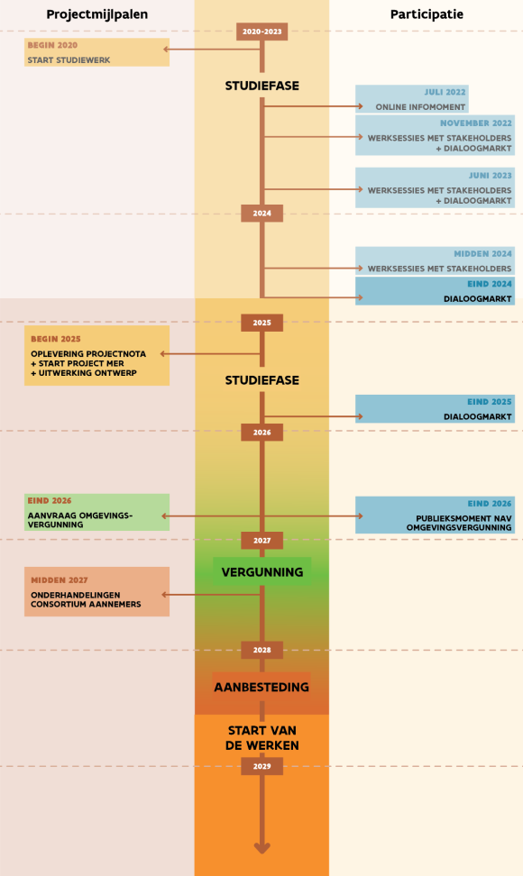 Hiernaast zie je de volledige tijdlijn van het project. In de tussentijd houden we je steeds op de hoogte via deze nieuwsbrief. |