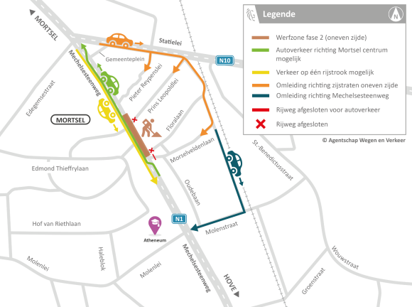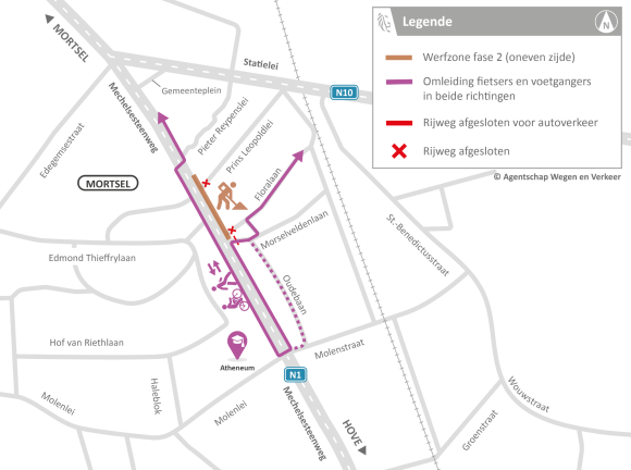 Het Agentschap Wegen en Verkeer (AWV) vernieuwt de Mechelsesteenweg (N1) van het Gemeenteplein tot aan de kruising met de Molenlei in Mortsel. De fietspaden richting Edegem/Hove worden breder en er komt een groenstrook tussen de parkeerstrook en het fietspad. Ook vernieuwen we de kruispunten met veilige fiets- en voetgangersoversteekplaatsen en de bushaltes maken we toegankelijk met verhoogde perrons. Tot slot krijgt de rijbaan op verschillende locaties een nieuwe toplaag asfalt. |