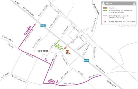 Voor gemotoriseerd verkeer zijn de Schrieksesteenweg, de handelaars en de school in Pijpelheide bereikbaar via de Broekmanstraat en Goorweg of via de Mechelbaan. Het parkeerverbod en de snelheidsbeperking van 50 km per uur blijven gelden. |