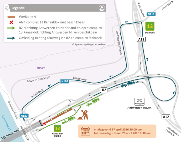Van 17 tot en met 20 april: R2 richting Gent/E34 onderbroken Omleiding via complex Stabroek |