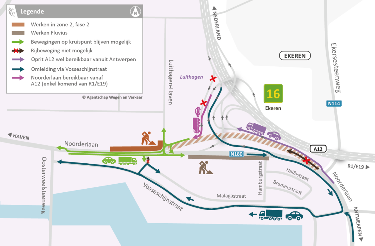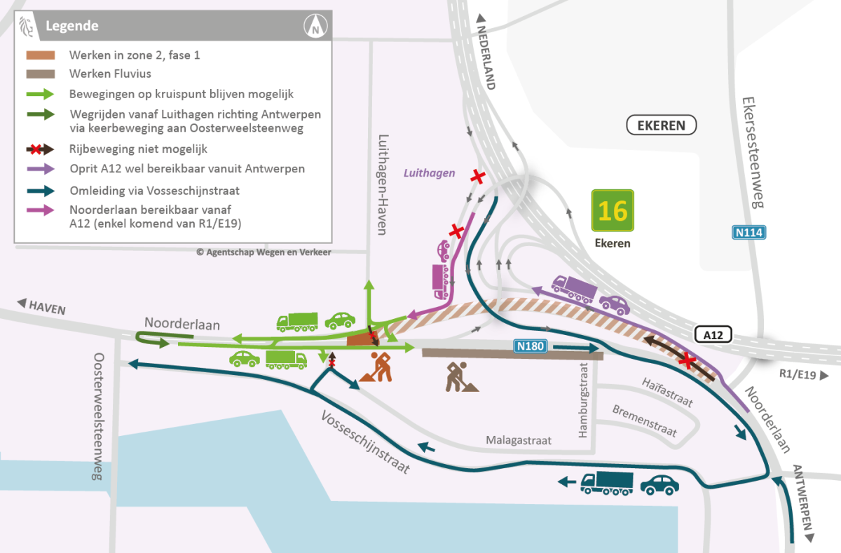 - van Antwerpen naar de haven volgt verkeer de bestaande omleiding via de Korte Wielenstraat en de Vosseschijnstraat.