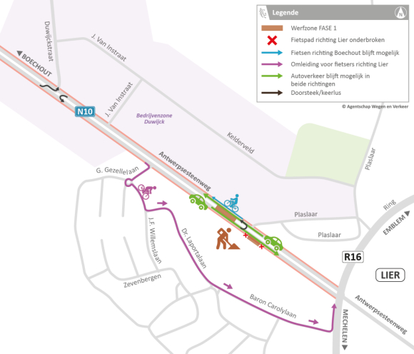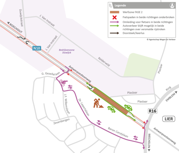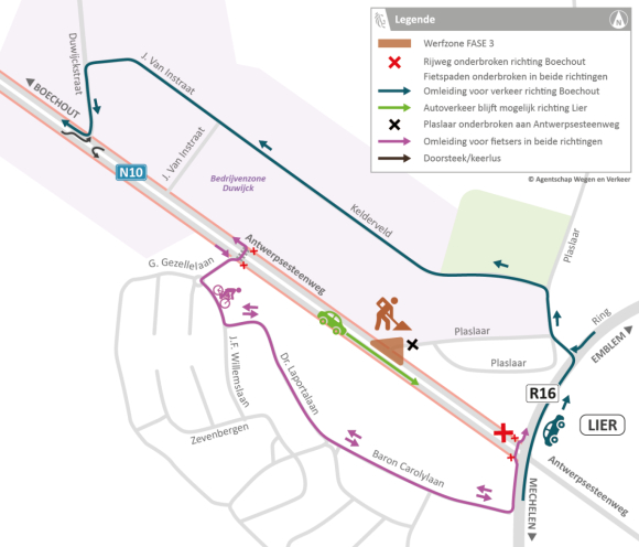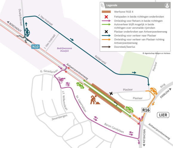 Vanaf 15 september tot het einde van de werken loopt Plaslaar dood op de werfzone. Verkeer komende uit Plaslaar met bestemming op de N10 of richting Boechout rijdt via Kelderveld of de R16. |