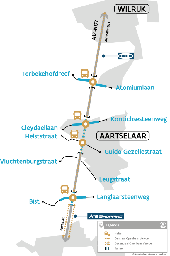 De vijf onoverzichtelijke en drukke kruispunten op de A12 in Aartselaar en Wilrijk-Zuid vormen een harde barrière voor wie dagelijks deze verkeersknopen moet trotseren. De veiligheid en de doorstroming van de A12 met Bist/Langlaarsteenweg tot en met de Terbekehofdreef/ Atomiumlaan laten te wensen over. AWV wil de inrichting verbeteren voor alle weggebruikers en voor de omliggende wijken ook werk maken van een beter evenwicht tussen het verkeer en het leven rond een drukke verkeersas. In november 2020 startte de onderzoeksopdracht voor de herinrichting van de vijf kruispunten en de tussenliggende weginfrastructuur. |