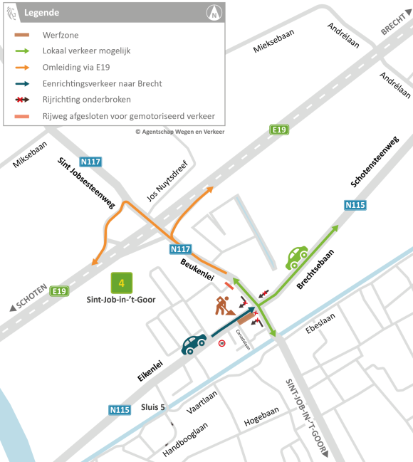 Doorgaand gemotoriseerd verkeer van Brecht naar Schoten en omgekeerd volgt een omleiding via de E19. Dat kan via complex Kleine Bareel [5] of via complex Brecht [3]. |