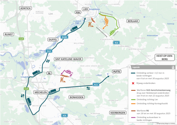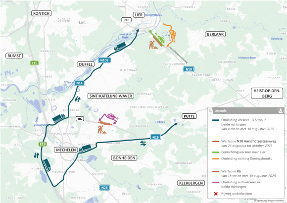 Van 4 tot en met 22 augustus wordt de Aarschotsesteenweg (N10) in Lier onderbroken vanaf de Schollebeekstraat tot en met de brug over het Netekanaal. Lokaal verkeer volgt een omleiding via Spreet om naar Heist-op-den-Berg te rijden en via de Misstraat, Bastijnstraat om naar Lier te rijden. Na 22 augustus blijft het eenrichtingsverkeer naar Lier op de N10 van kracht. |