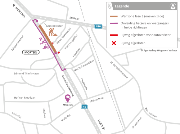 - Opgelet, aan de oneven zijde van N1 geldt tijdelijk tweerichtingsverkeer tussen de Prins Leopoldlei en Mortselveldenlaan. Zo kan je je aan de oneven zijde tussen de Mortselveldenlaan en de Prins Leopoldlei of in de Prins Leopoldlei bereiken.