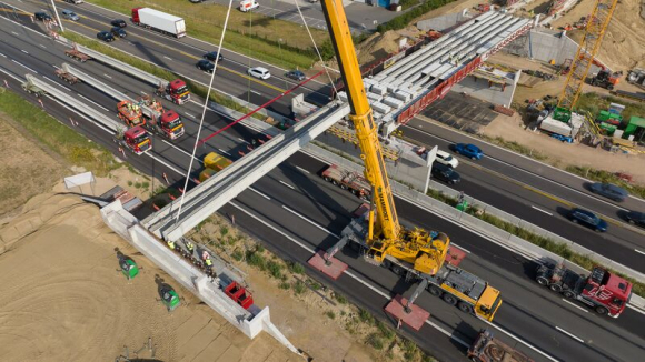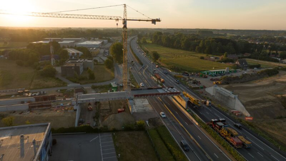 Sfeerbeelden van de plaatsing van de brugliggers van brug B5 in Wommelgem (zomer 2022). © AWV |