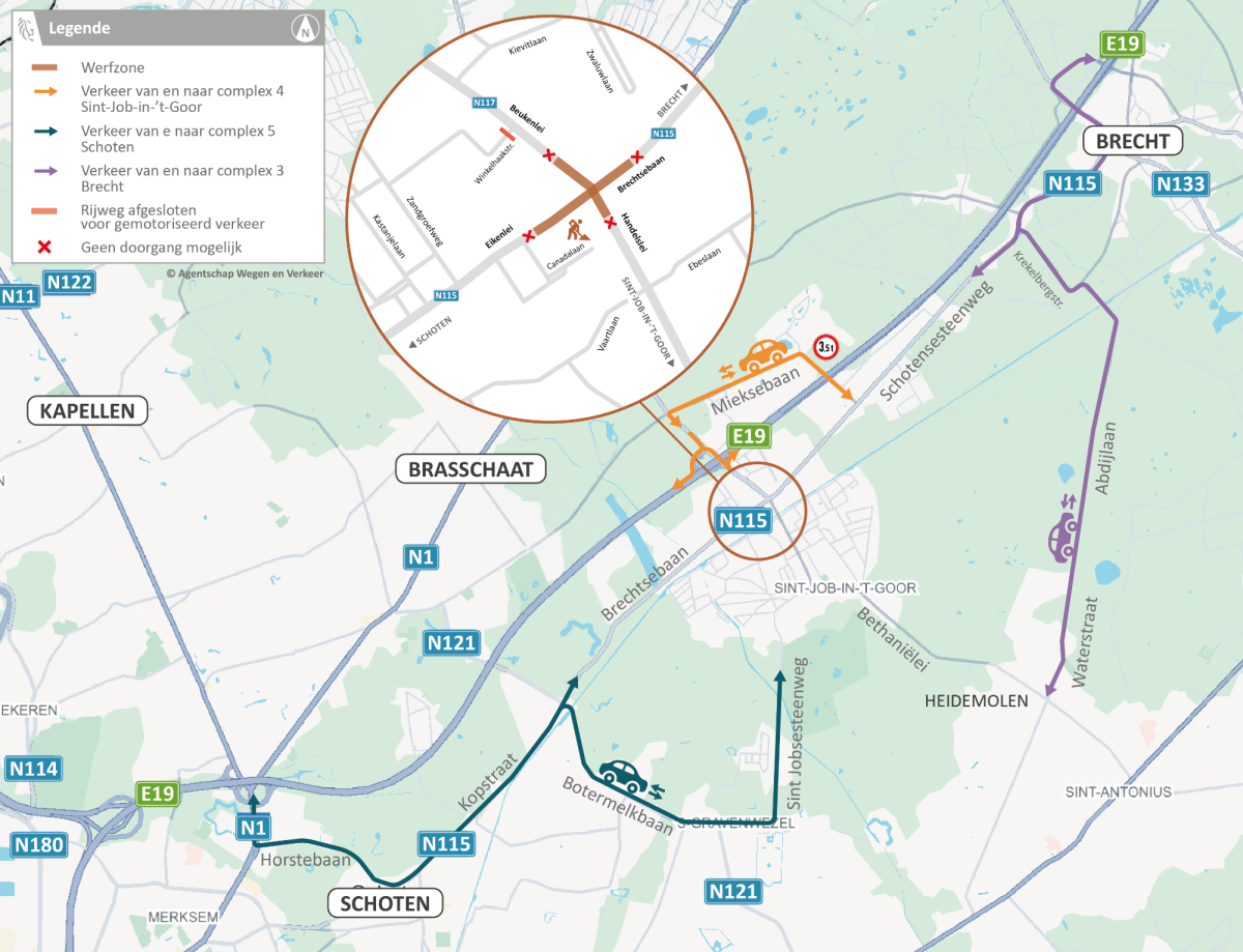 Doorgaand gemotoriseerd verkeer en zwaar verkeer (+3,5t) van Brecht naar Schoten en omgekeerd volgt een omleiding via de E19. Dat kan via complex Kleine Bareel [5] of via complex Brecht [3].