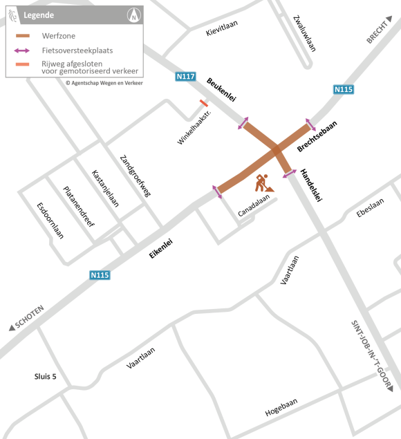 - Via de Vaartlaan en Sluisvijfbaan rijdt u vanaf de Handelslei naar de Eikenlei (N115) en richting Schoten. In de Vaartlaan geldt eenrichtingsverkeer tussen de sluis en de Handbooglaan. Volg vanuit het centrum de omleiding via de Bethaniëlei (Schilde) richting Brecht.