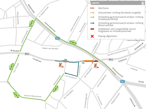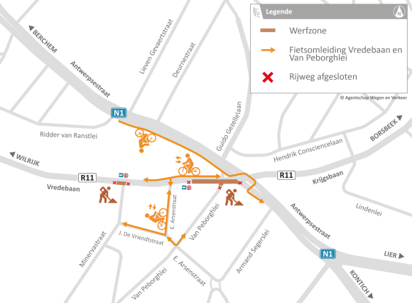Gemotoriseerd verkeer richting Wilrijk, komende van Borsbeek of van het centrum van Mortsel, volgt aan het kruispunt een omleiding via de N1, Jozef Hermanslei en Vredebaan.