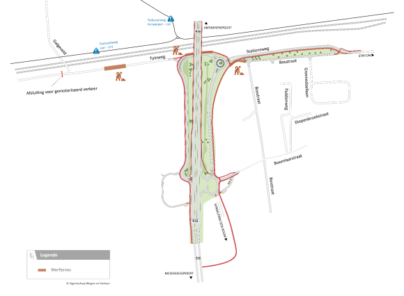 Fietsverkeer tussen Zevenbergen/Lint/Boechout en het station neemt de voetgangerstunnel en de fietssnelweg F11. Dat is dezelfde omleiding als tijdens de aanleg van de Stationsweg.