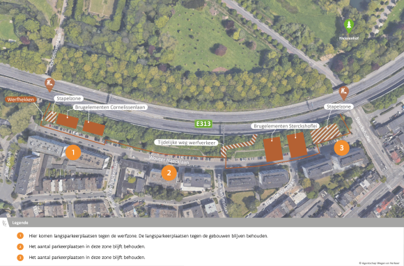 De werfzone bevindt zich tussen de Wouter Haecklaan en de snelweg. Om de werf veilig te kunnen organiseren, voor de arbeiders en omwonenden, moeten we parkeerplaatsen innemen en loopt de Wouter Haecklaan dood op de Sterckshoflei. Tussen de Collegelaan en de Pieter Van Isackerlaan voorzien we aan elke zijde van de Wouter Haecklaan langsparkeerplaatsen. Lokaal verkeer kan altijd in beide richtingen passeren en de parkeergarages blijven vlot bereikbaar. De parkeerplaatsen tussen de Pieter Van Isackerlaan en de Hendrik Van Uffelslaan blijven behouden. |