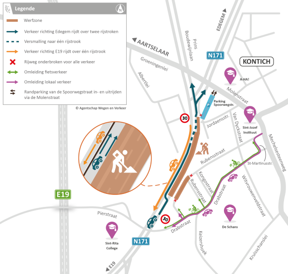 De huidige verkeerssituatie op de N171 blijft gelden. We herhalen dat de maximumsnelheid ter hoogte van de werken 30km/u bedraagt. Doorgaand verkeer van Kontich centrum richting de N171 blijft de huidige omleiding via de Sint-Martinusstraat en de Drabstraat volgen |
