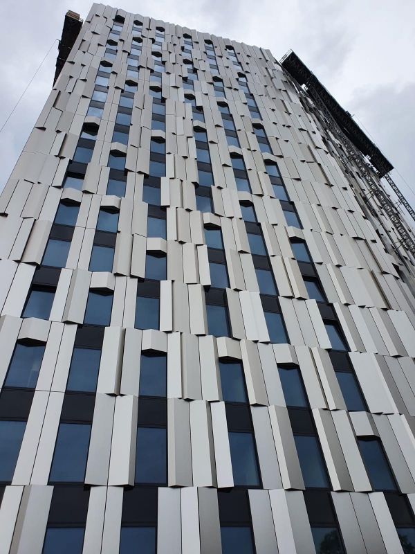The X-3D product line has been used in the balconies, where the material has been perforated prior to vertical anodising. The non-perforated material has been anodised on our horizontal anodizing lines. A nice example of how state of the art metal quality and anodising of 2 different metal gauges can be combined harmonously. |