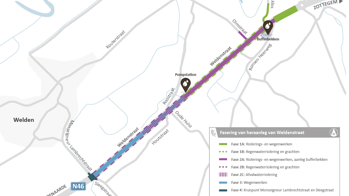 De herinrichting van de Weldenstraat start op 3 februari 2025. We starten aan de rotonde Zwalm en werken zo richting Oudenaarde. De eerste fase duurt - als alles vlot verloopt - tot juni 2025. We voeren de volgende werken uit: we leggen regenwater- en afvalwaterriolering en grachten aan, er komt riolering op Schuisplanklos en de weg wordt vernieuwd. |