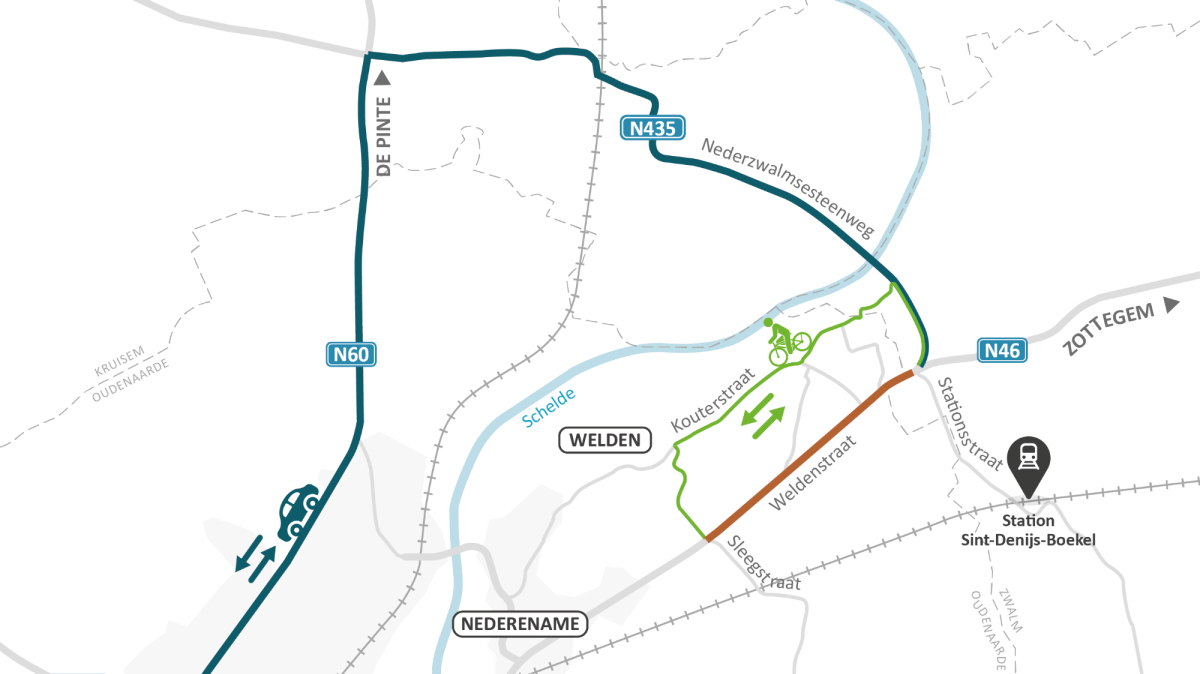 Vanaf 3 februari gaan de werken in de Weldenstraat van start en gelden er nieuwe verkeersmaatregelen. Fietsers volgen in beide richtingen een omleiding via de Monseigneur Lambrechtstraat, Kouterstraat, Schuisplanklos, de fietsbrug over de Zwalmbeek, Schuisplankweg en de Schoolstraat. Doorgaand gemotoriseerd verkeer tussen Oudenaarde en Aalst rijdt om via de Westerring (N60) richting De Pinte, Kruishoutemsesteenweg (N435), Alfred Amelotstraat (N435), Nederzwalmsesteenweg, Schoolstraat (N435) en de Hoogstraat (N46). |