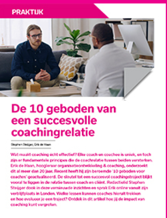 Wat maakt coaching écht effectief? Elke coach en coachee is uniek, en toch zijn er fundamentele principes die de coachrelatie tussen beiden versterken. Erik de Haan, hoogleraar organisatieontwikkeling & coaching, onderzoekt dit al meer dan 20 jaar. Recent heeft hij zijn beroemde ‘10 geboden voor coaches’ geactualiseerd. De sleutel tot een succesvol coachingstraject blijkt vooral te liggen in de relatie tussen coach en cliënt. Redactielid Stephen Steijger dook in deze vernieuwde inzichten en sprak Erik online vanuit zijn verblijfplaats in Londen.