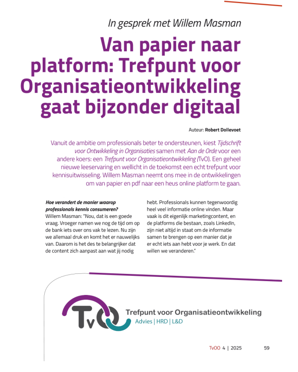 Vanuit de ambitie om professionals beter te ondersteunen, kiest Tijdschrift voor Ontwikkeling in Organisaties samen met Aan de Orde voor een andere koers: een Trefpunt voor Organisatieontwikkeling (TvO). Een geheel nieuwe leeservaring en wellicht in de toekomst een echt trefpunt voor kennisuitwisseling. Willem Masman neemt ons mee in de ontwikkelingen om van papier en pdf naar een heus online platform te gaan. |