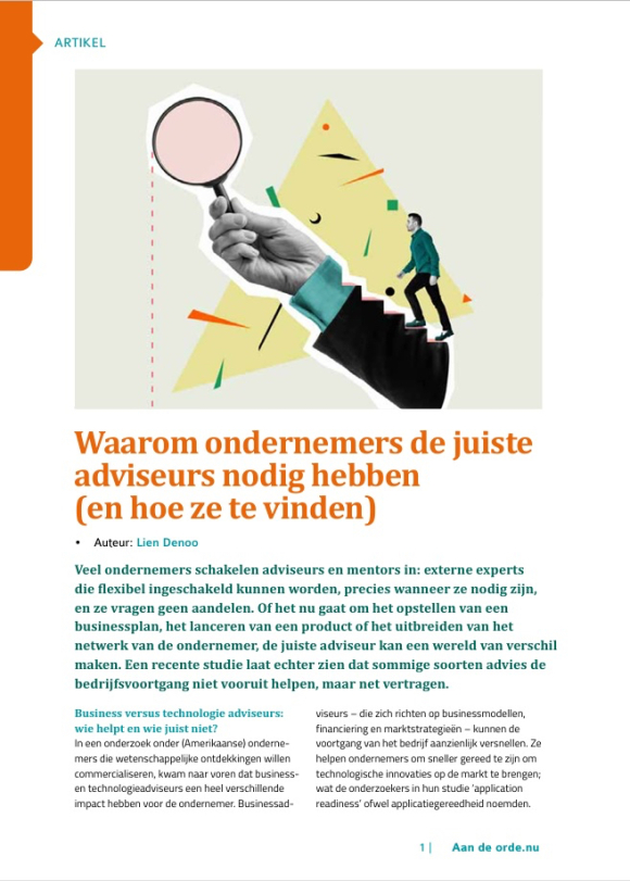 Veel ondernemers schakelen adviseurs en mentors in: externe experts die flexibel ingeschakeld kunnen worden, precies wanneer ze nodig zijn, en ze vragen geen aandelen. Of het nu gaat om het opstellen van een businessplan, het lanceren van een product of het uitbreiden van het netwerk van de ondernemer: de juiste adviseur kan een wereld van verschil maken. Een recente studie laat echter zien dat sommige soorten advies de bedrijfsvoortgang niet vooruit helpen, maar net vertragen. |