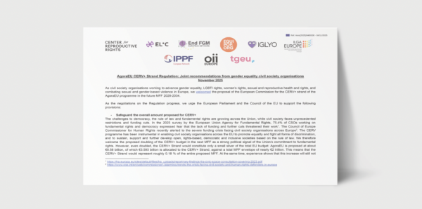 At the end of the year, we submitted our contribution to different open consultation including the one on the new civil society strategy. While we are glad to see the adoption of the Union’s first ever civil society strategy at a time of increasing backlash, we are worried by the absence of gender-sensitive measures and the absence of specific measures for actors working on sexual and reproductive health and rights and gender equality (for more information read the reaction of our partners).