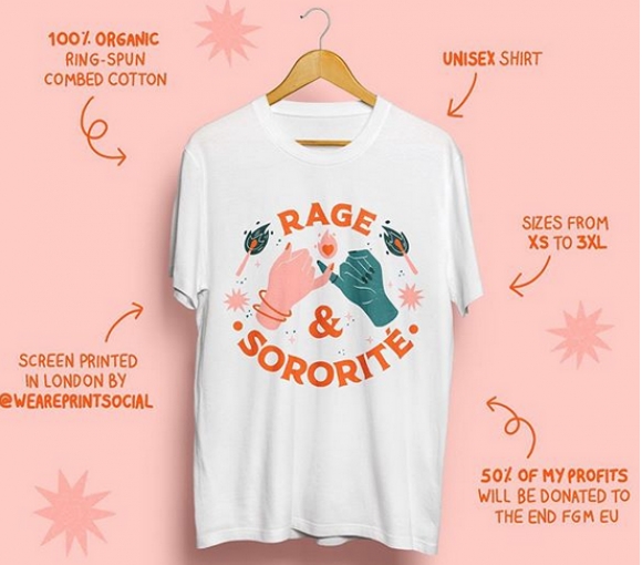 Manon Louart, an amazing artist, launched a limited "Rage & Sororité" T-shirt design with the help of Print Social. Manon decided to donate 50% of her profits to End FGM EU.