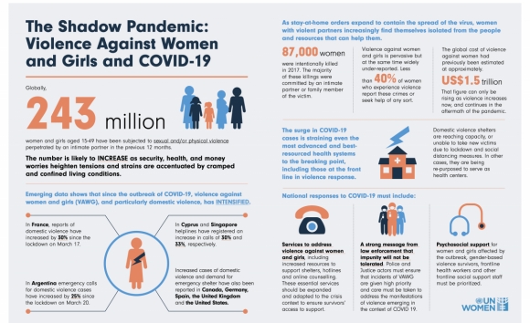 | | UN Women: Infographic on "The Shadow Pandemic" | | In times of crisis, violence against women and girls is likely to increase as security, health, and money worries heighten tensions and accentuate strains. UN Women released an infographic on the link between Violence Against Women and Girls and COVID-19. | | |